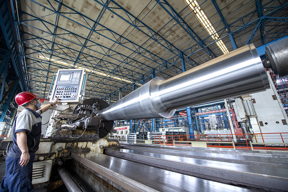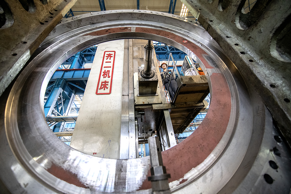 北方重工重大部件分廠員工正在加工旋回破碎機主軸