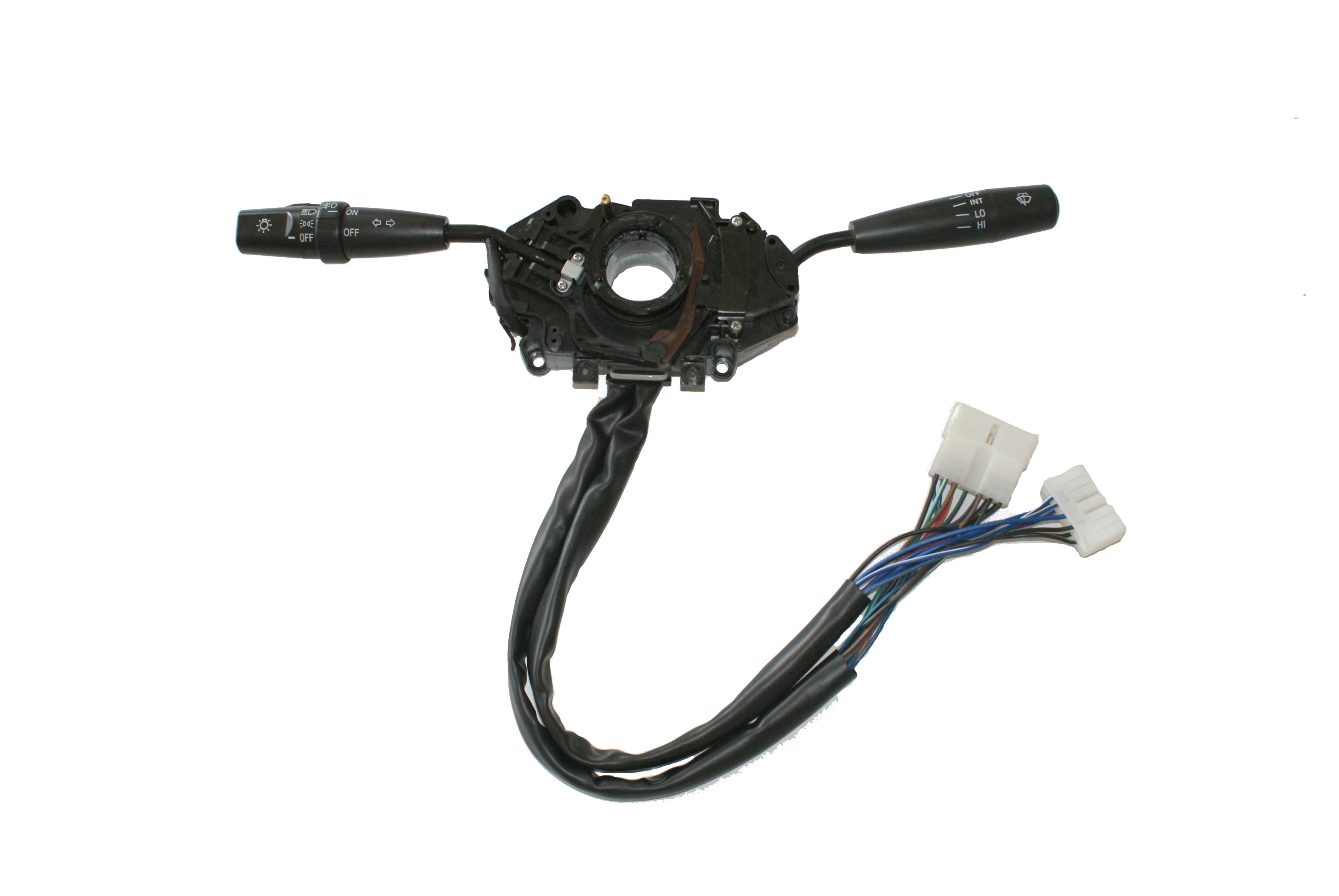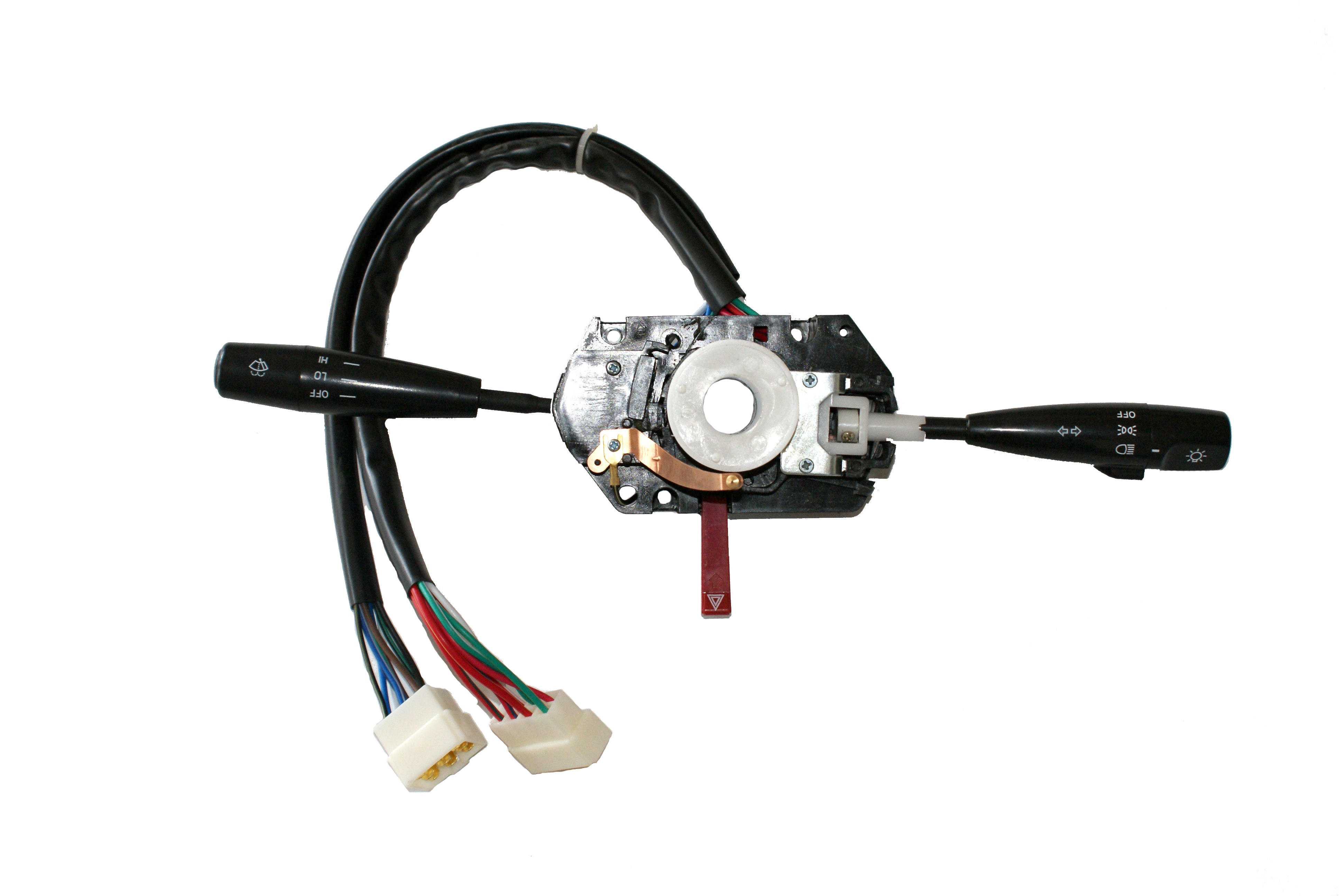 汽車組合開關(guān)一個(gè)操作手柄控制雨刮和洗滌器開關(guān),另一個(gè)操作手柄控制轉(zhuǎn)向燈、車燈和變光開關(guān),另外一些汽車組合開關(guān)還裝有喇叭開關(guān)和多個(gè)備用開關(guān),可以控制汽車上多種電器的通斷。